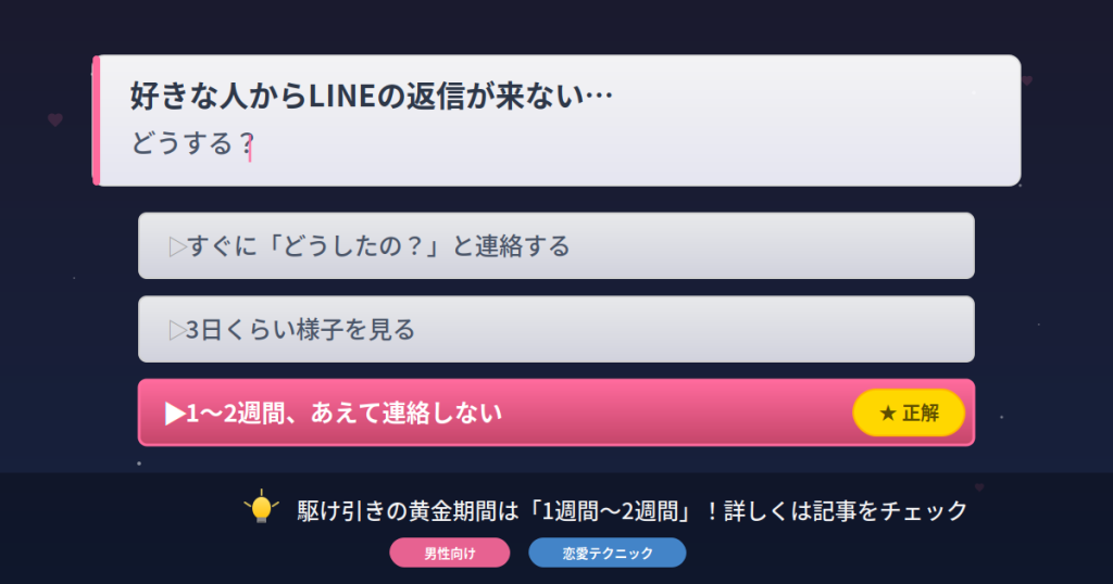 また、2週間以上空くと「自然消滅」と判断される可能性も出てきます。せっかく築いた関係が、駆け引きのつもりが終わりになってしまう…なんて本末転倒ですよね。